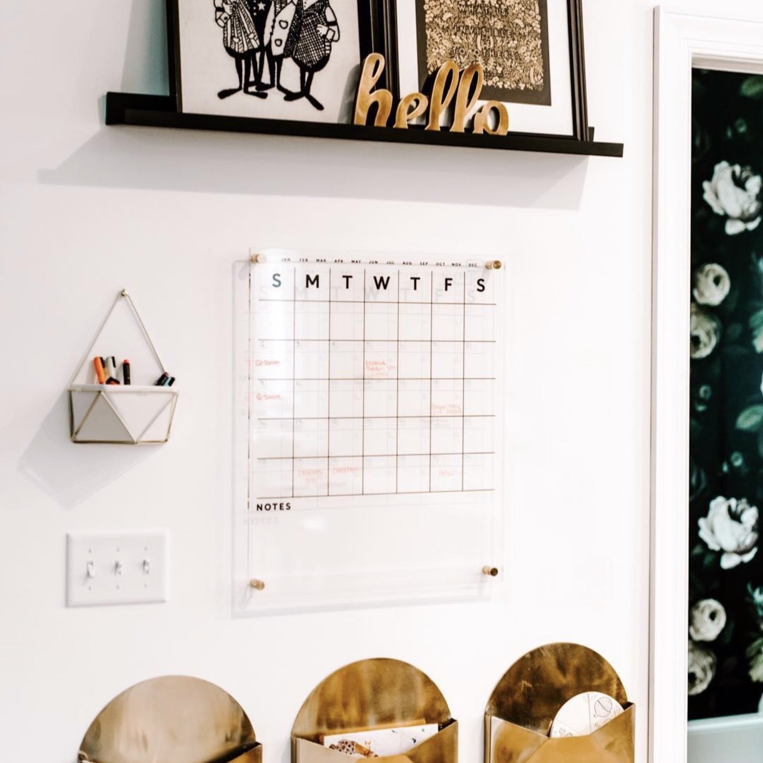 A close-up reveals two clear acrylic monthly wall calendars with notes from Girl Friday Shop, mounted with gold standoffs. The 3/16” acrylic on the left and 3/8” acrylic on the right highlight thickness differences in this elegant, durable design.
