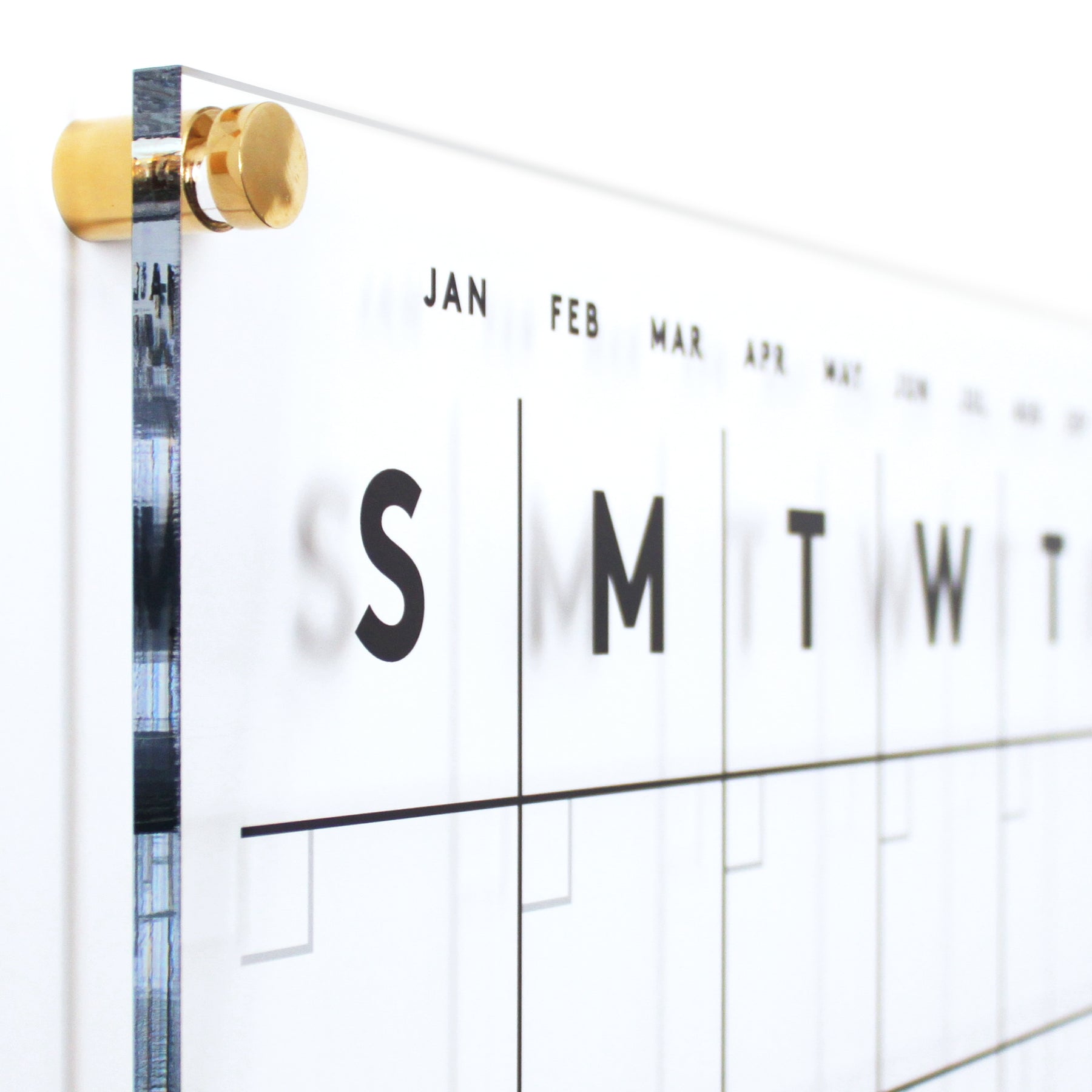 Girl Friday Shops Clear Acrylic Monthly Wall Calendar (Horizontal) has weekday columns and five-week rows. It features durable gold standoff mounts, black month names at the top, and is compatible with wet-erase markers for versatile planning.