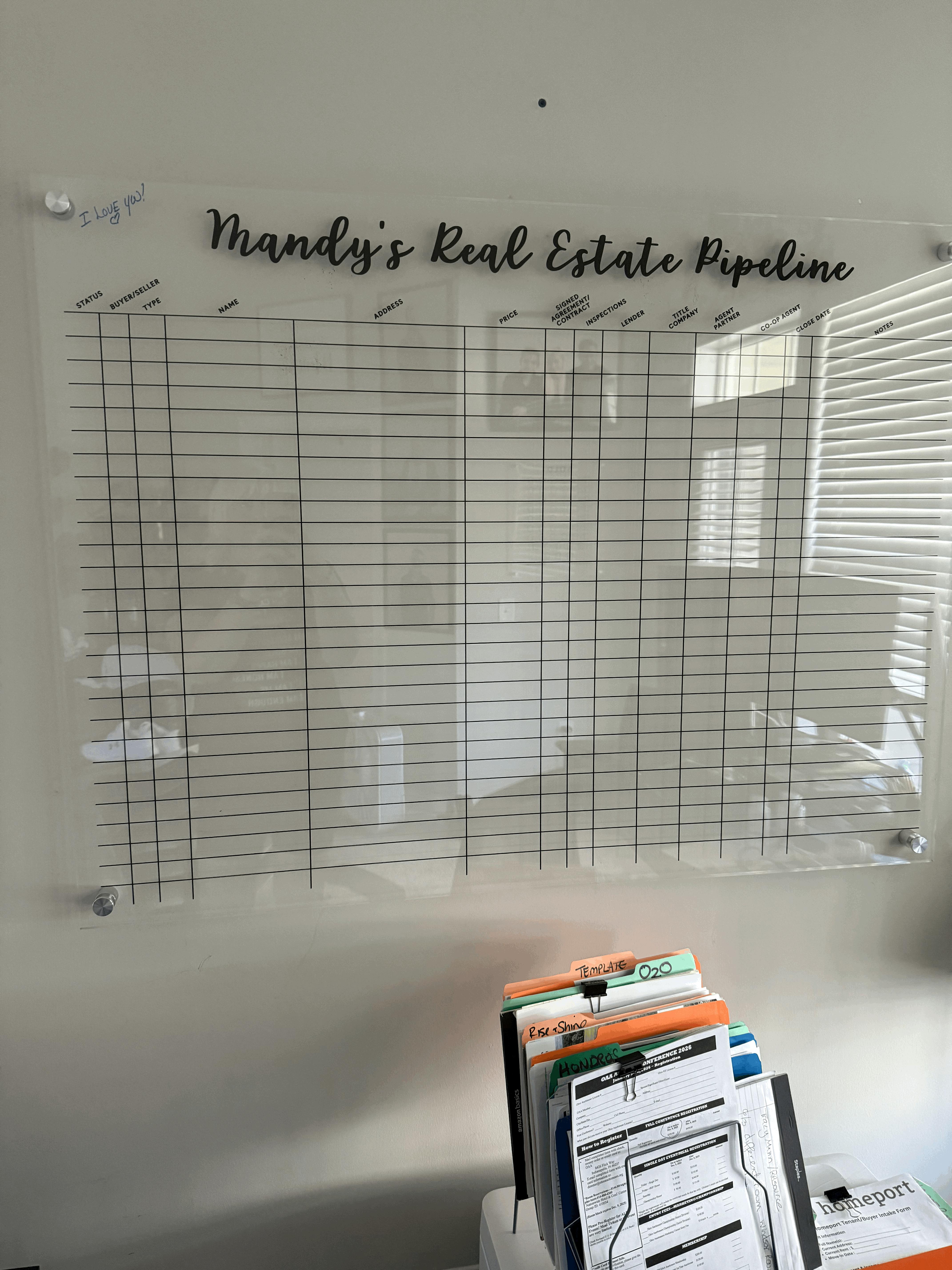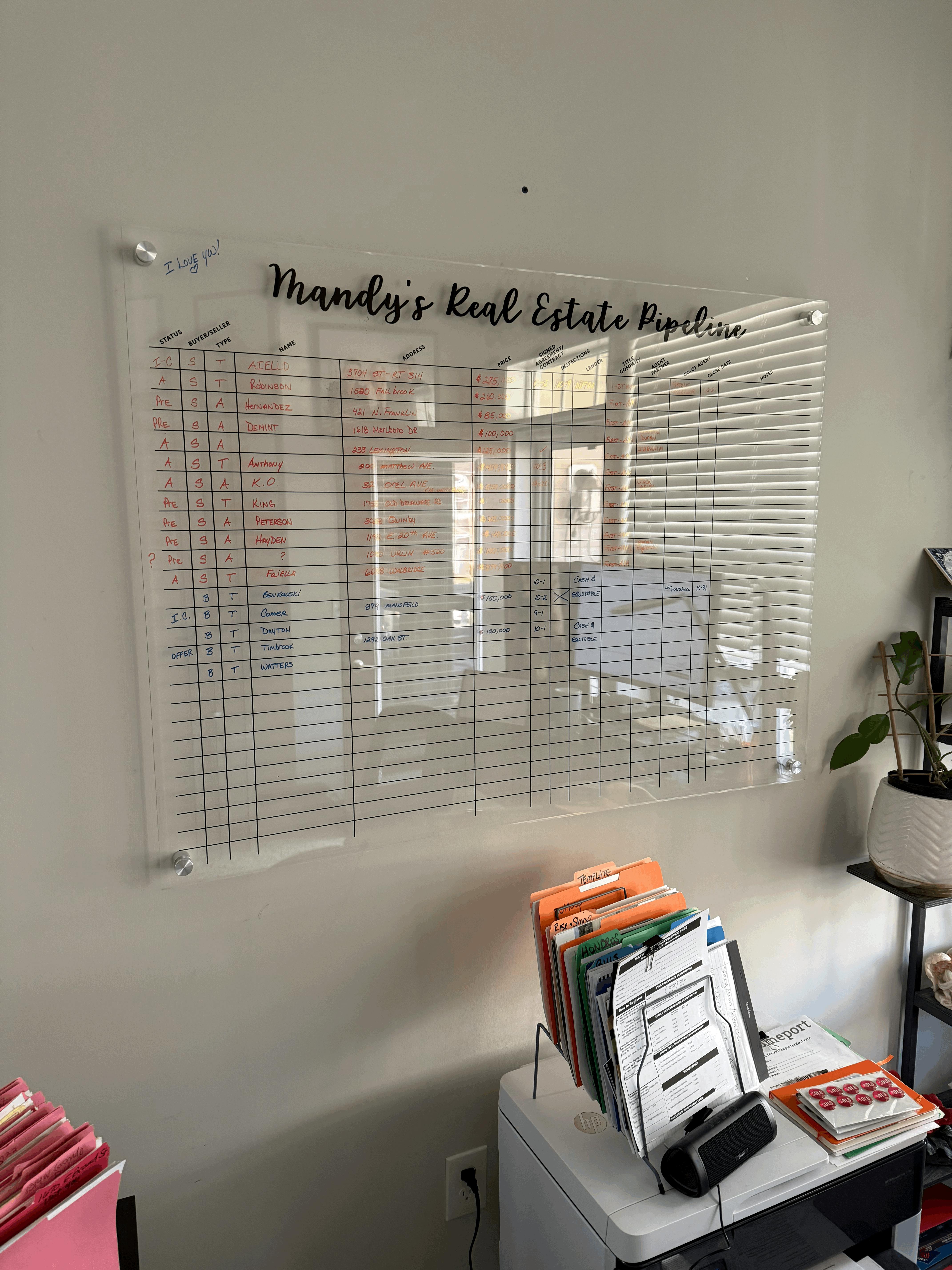I have wanted this pipeline board for quite some time and finally pulled the trigger. I am super excited to now have a custom board to manage my pipeline. I have already put it to use and find the visual reminder daily to be a big motivator. Great quality right down to fixtures to hang the board. Thanks for a great addition to my real estate practice.