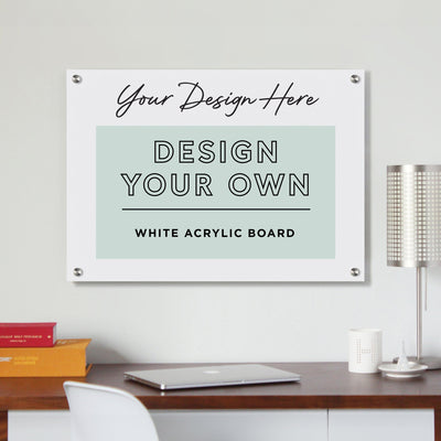 This amazing whiteboard is similar to our clear acrylic boards, but it is acrylic with a white backing, so you do not see the wall behind it. We can customize it for your business!