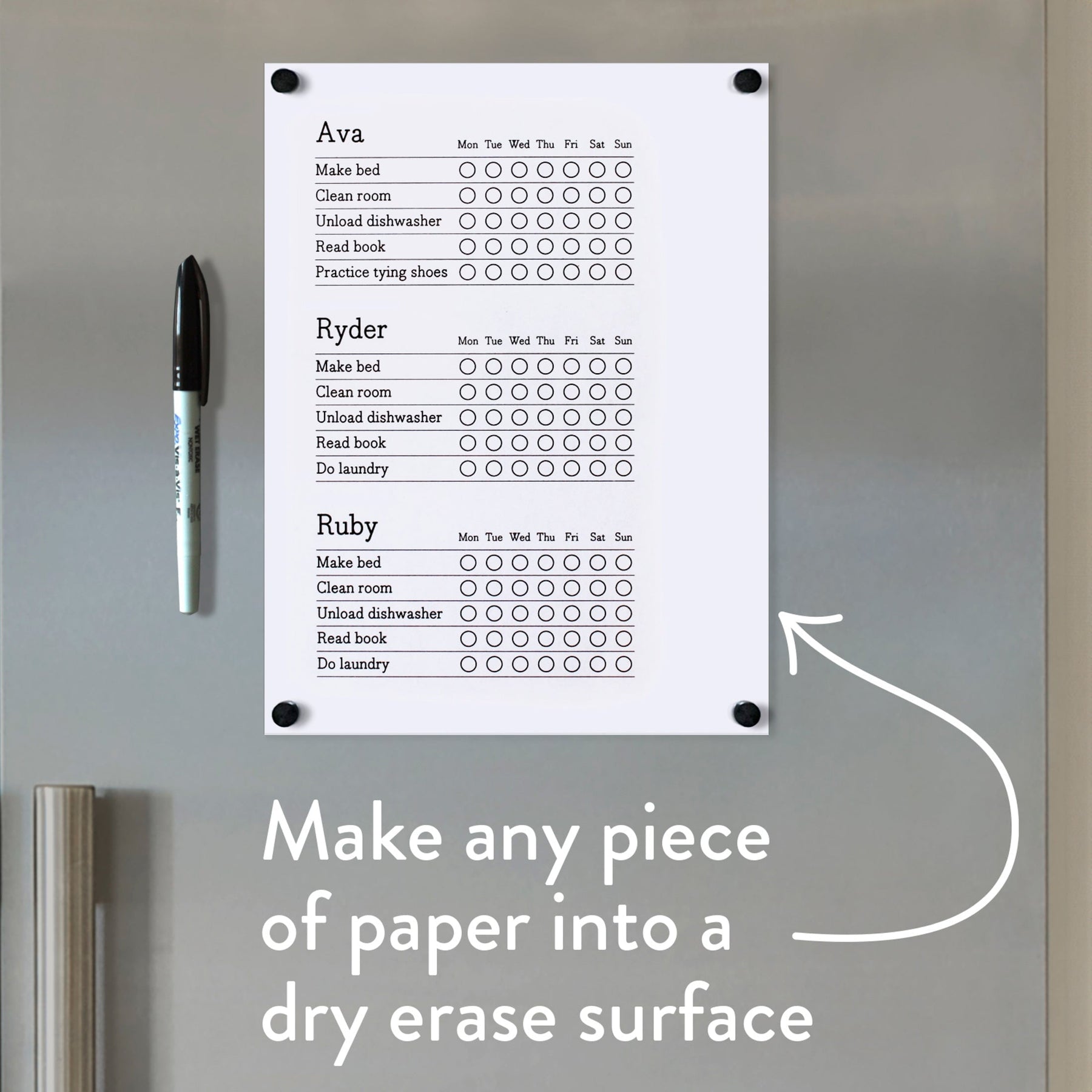 Turn any printed chore chart into a dry erase surface! Clear Slate keeps your chore charts and lists neat and reusable with our Magnetic Dry Erase Clear Cover. Designed to fit over any 8 1/2" x 11" document, it is held securely in place by strong magnets.