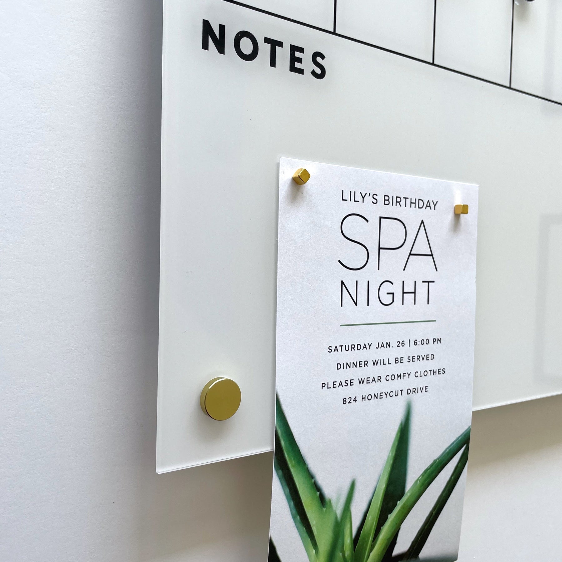 A whiteboard with NOTES at the top features a paper detailing Lilys birthday Spa Night, set for Saturday, Jan 28, 6:00 PM, at 824 Honeycut Drive. The paper is secured with stylish Gold Strong Magnets by Girl Friday Shop.
